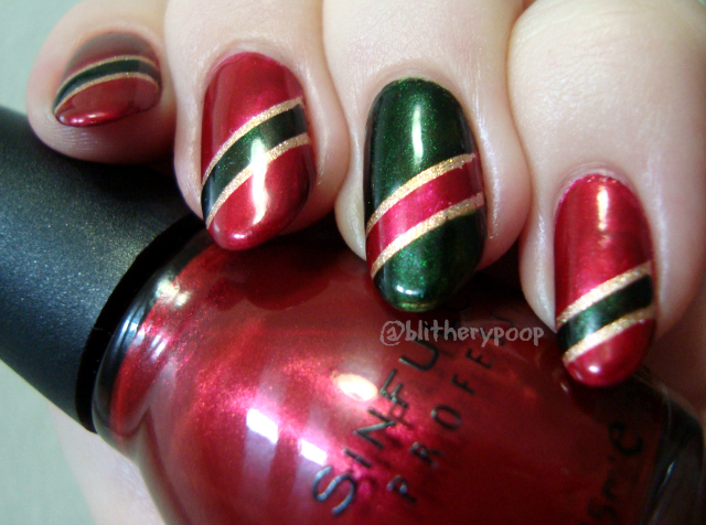 This is my NOTD for tonight's shopping trip with The Beard. It was inspired partly by wrapping paper and partly by a failicure from two years ago. The idea is the same, but the execution's a little different. This time around I used Wet n Wild Poison Ivy and Sinful Colors Hot Hot Heat over OPI Opening Night Champagne. I'm happy with how it turned out, but not with these photos. It's been so long since I took any in fully artificial light that I've forgotten how to not make my fingers look green. Boo.